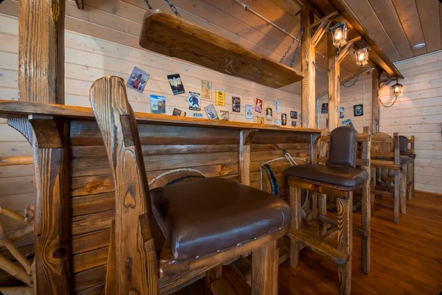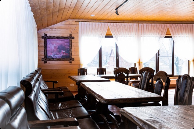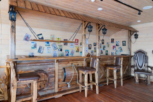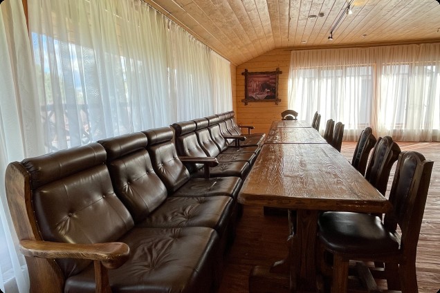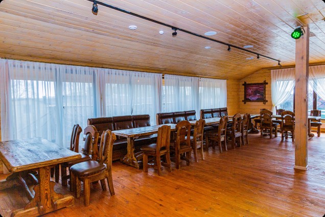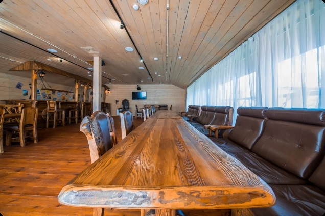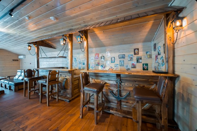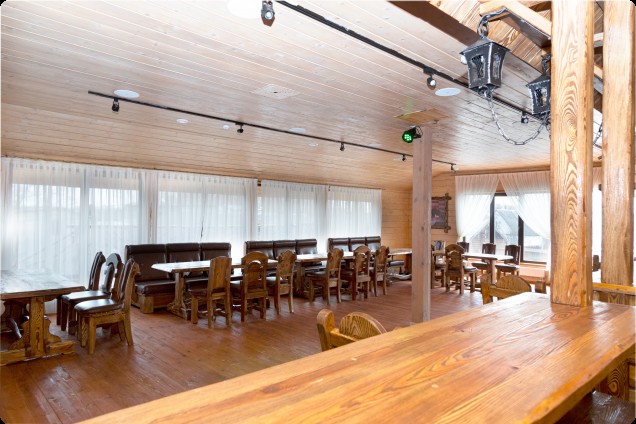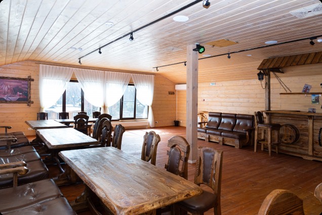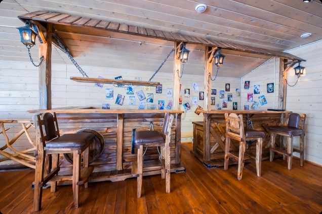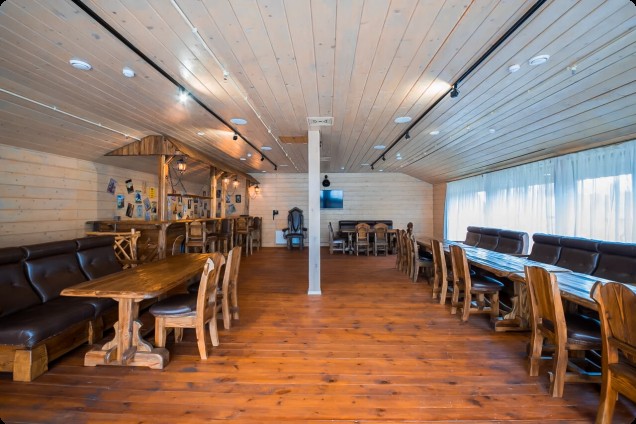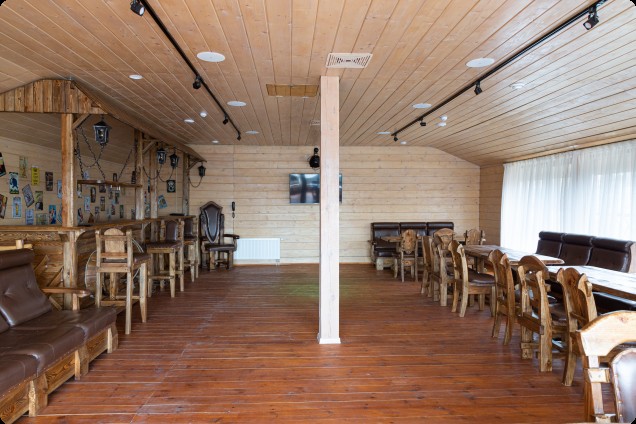 — 3 этаж: впечатляющий деревянный банкетный зал с резной барной стойкой, первоклассным звуком и колонками. Пространство идеально подходит для любых мероприятий — от дня рождения до корпоратива.